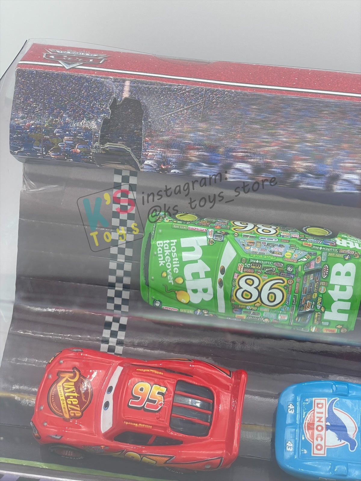 DISNEY PIXAR CARS 1:55 BY MATTEL - RACE AND CHASE 4 PACK - LIGHTNING MCQUEEN, CHICK HICKS, THE KING AND RE-VOLTING - BNIB